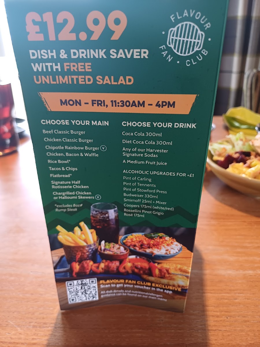 Located at Carr Wood Rd, Colorado Way, Castleford WF10 4PS, the Harvester Winding Wheel Castleford offers a delightful dining experience, blending comfort and quality with its varied menu. The menu at this Harvester location is designed to cater to a wide range of tastes, from classic British dishes to fresh, vibrant salads and indulgent desserts. The restaurant’s signature feature is the salad bar, which offers a colorful selection of fresh vegetables, toppings, and dressings that diners can customize to their liking, making it an ideal choice for those seeking healthier options.